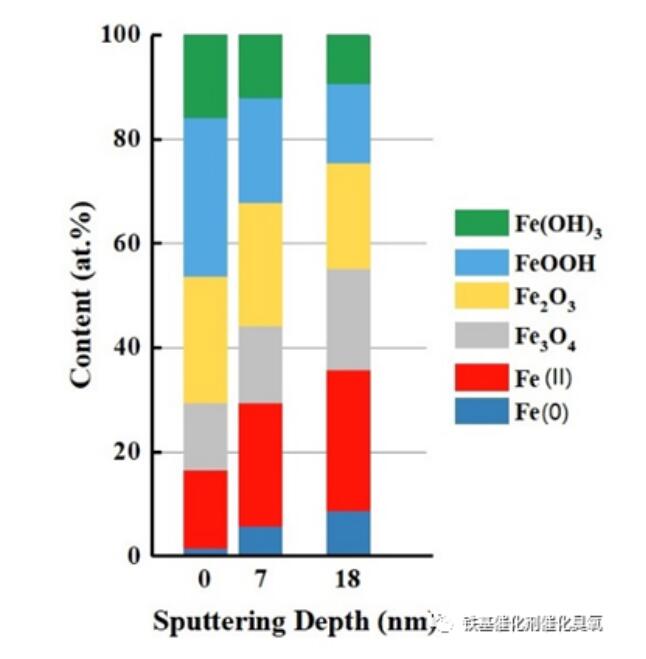 我們的鐵基催化劑與其他催化劑不同,不是通過(guò)“浸漬”、“燒結(jié)”等工序制備的;而是通過(guò)在液相中迅速氧化,使鐵刨花表面形成致密γ-FeOOH膜(當(dāng)然是相對(duì)的,詳見(jiàn)XPS蝕刻表征圖,表面以Fe(III)為主),成為臭氧分解的催化層;同時(shí),它又是內(nèi)部Fe(0)氧化的鈍化層。這種制備方法優(yōu)點(diǎn):一是工藝簡(jiǎn)單,一步完成;二是表面主要成份為γ-FeOOH,催化臭氧效果好。而燒結(jié)方法,表面不會(huì)形成過(guò)渡金屬羥基化物(Me-OH),理論認(rèn)為:表面羥基(-OH)才是催化臭氧的有效官能團(tuán)。