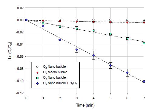 我們可以通過產生納米氣泡來增加氣泡的總表面積。較大的表面積意味著臭氧氣體從氣體轉移到水中的可能性更大。因此,我們比較了大臭氧和納米臭氧的臭氧傳質(圖1)。從0到7分鐘,納米臭氧氣體向水中的傳輸速率(1.67 mg / L / min)比大型臭氧(0.17 mg / L / min)快9.8倍。由于其在水溶液中的耐久性,納米臭氧濃度的半衰期比大臭氧的半衰期高23倍。使用納米氣泡時,臭氧濃度的半衰期更長,可以用氣泡排斥理論來解釋。納米臭氧可以增強臭氧在水相中的耐久性。由于OH離子的選擇性吸附,納米氣泡在各種pH值下都帶有負電荷。由于H +(-1127 kJ / mol)的水合焓比OH-(-489 kJ / mol)的水合焓低得多,因此納米氣泡的帶電表面會產生排斥力。這種現象有助于避免氣泡合并。