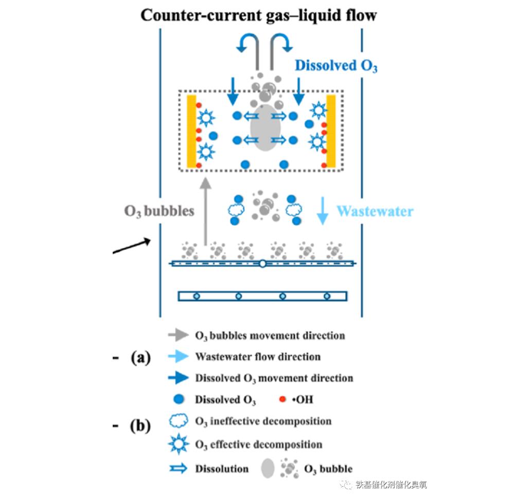 從工程工藝角度,催化劑整砌填料是反應(yīng)的內(nèi)因;而反應(yīng)器,是催化臭氧化的外因。我曾吃驚地發(fā)現(xiàn),我們對(duì)此了解得甚少,由此限制了催化臭氧化效率的提高。除氧化反應(yīng),反應(yīng)器中多相變化有:一相溶解(臭氧向水相溶解);二相流動(dòng)(氣泡上浮、水流動(dòng));三種分解(臭氧在氣相分解、在液相無(wú)效分解;在催化劑區(qū)有效分解),如圖示。