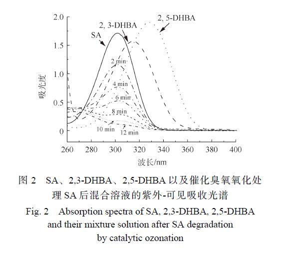 圖 2為 SA、2,3-DHBA和 2,5-BHBA的紫外-可見吸收光譜圖以及 CaO催化臭氧氧化處理后的紫外-可見吸收光譜。可以看出,SA在 302 nm處有 很大吸收峰,而 2,3-DHBA和 2,5-DHBA分別在315 nm和 330 nm處出現 很大吸收峰,SA經過催化臭氧氧化處理后 很大吸收峰波長向右移動,在2,3-DHBA和 2,5-DHBA的大吸收峰處有一定的吸收,證明在該過程中有 · OH產生。