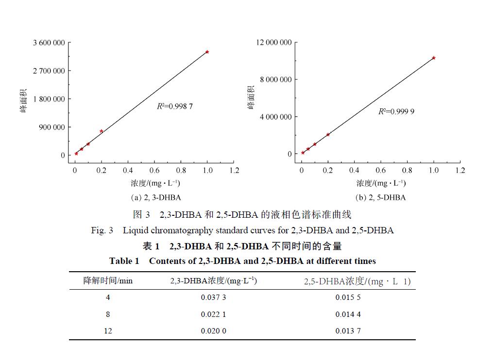 水楊酸 (SA)羥基化實驗是另外一種間接檢測羥基自由基的方法。羥基自由基具有存在時間短、不穩定的特點,但 SA可以作為 · OH的捕捉劑,SA與 · OH反應后會生成較為穩定的 2,3-二羥基苯甲酸 (2,3-DHBA)和 2,3-二羥基苯甲酸 (2,5-DHBA)。本研究結合紫外-可見分光光度計跟蹤 SA與  · OH反應后產物,再結合液相色譜-質譜聯用儀對2,3-DHBA和2,5-DHBA 進行定量分析。