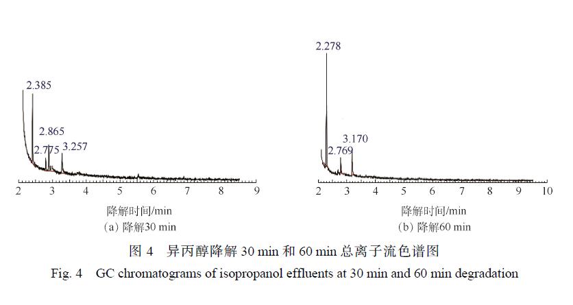為了研究廢液的降解路徑,以廢液主要成分異丙醇和乙二醇單丁醚為例進行探討,對 2種物質進行降解并對降解產物用GC/MS進行檢測。