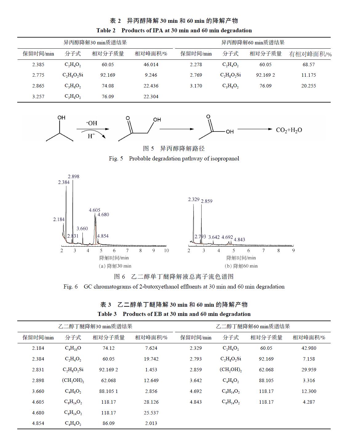 乙二醇單丁醚降解 30 min和 60 min后的總離子流色譜圖如圖 6所示,對應的中間產物信息如表 3所示。乙二醇單丁醚的降解中間產物主要有 1-丁醇、乙二醇、4-羥基-2-丁酮、丁內酯和乙酸。