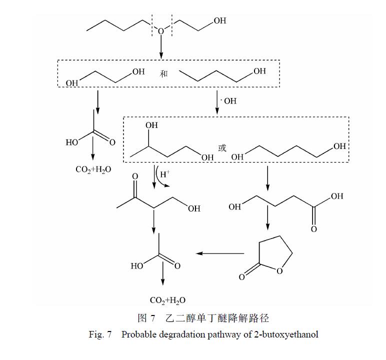 另外有一部分乙二醇單丁醚被氧化斷鏈形成 1-丁醇,1-丁醇與 · OH 結合,結合產物再被氧化形成酮或酸, 很后再被氧化形成小分子酸乙酸, 很后形成CO2和H2O。