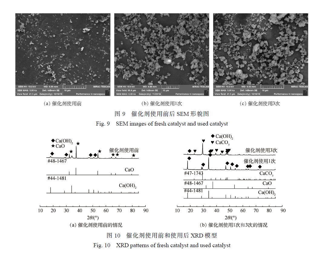 圖 10顯示的是催化劑使用前后的 XRD譜圖。圖 10(a)得到的 XRD譜圖與標準 JCPDS對照可知,2θ為 32.3°、37.4°、53.9°對應的是 CaO的特征吸收峰,2θ為 18°、28.7°、34.1°、47.1°和 50.9°對應的是 Ca(OH)2的特征峰,表明在使用前的催化劑中 Ca(OH)2的特征峰也有一定的吸收強度。使用前的催化劑中 CaO的特征峰十分清晰且強度較大,表明其主要成分是 CaO,但也含有少量的Ca(OH)2,說明催化劑在存放過程中或者樣品測試時受到空氣中水分的影響。