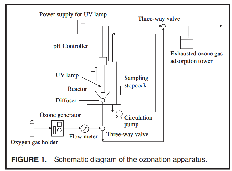 H2O2的濃度分別為16.7、50.1、100.2、200.4和400.8 mg L−1。將1.6 L的樣品溶液置于30 cm高、9.5 cm內(nèi)徑的反應(yīng)器中,在常溫下用含29.2-36.9 mg臭氧/L的鼓泡氧氣以0.5 L min - 1的流速處理4 h。臭氧化氣體由臭氧發(fā)生器產(chǎn)生。作為對(duì)照處理,分別進(jìn)行pH 6 ~ 8的臭氧化處理,20、120 W的低壓紫外燈紫外照射,0.5 L min - 1的氧氣曝氣,0.1、0.3、0.6、1.2、2.4 mL的H2O2加入。通過加入1 N HCl或1 N NaOH,將溶液的pH控制在6-8。
