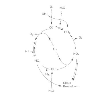 溶解的臭氧的穩定性容易受pH,紫外線,臭氧濃度和自由基清除劑濃度的影響。在過量自由基清除劑存在下測量的分解速率(脂族和芳族)可以防止二次反應,這是通過偽一級動力學表示的。臭氧分解在鏈過程中發生,其可以由下面的圖1中所示的反應表示(基于Staehelin等人,Tomiyasu等人的兩個 很重要的模型),包括引發步驟,傳播步驟和鏈式反應步驟的中斷。 。
