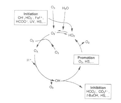 自由基反應的引發劑是能夠從臭氧分子誘導形成超氧離子O2的那些化合物。這些是無機化合物(羥基離子OH-,氫過氧化物離子HO2 - 和一些陽離子),有機化合物(乙醛酸,甲酸,腐殖質......)和253.7 nm的紫外線輻射。